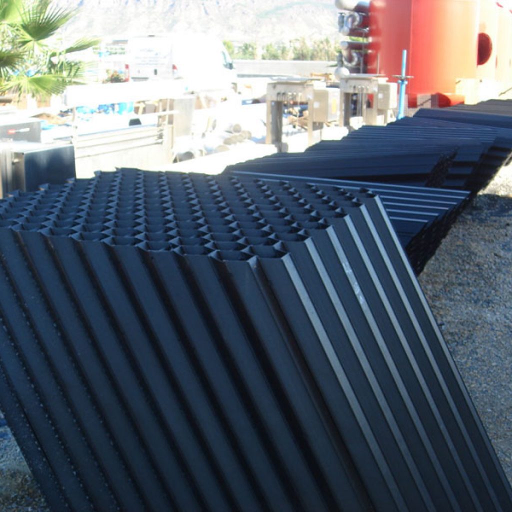 Los módulos lamelares TECNOTEC aumentan la superficie especifica de contacto provocando el aumento de la velocidad de separación de las partículas en suspensión, y por lo tanto, aceleran el proceso de sedimentación. Los lamelares son ideales para procesos de depuración, potabilización y tanques de tormenta.