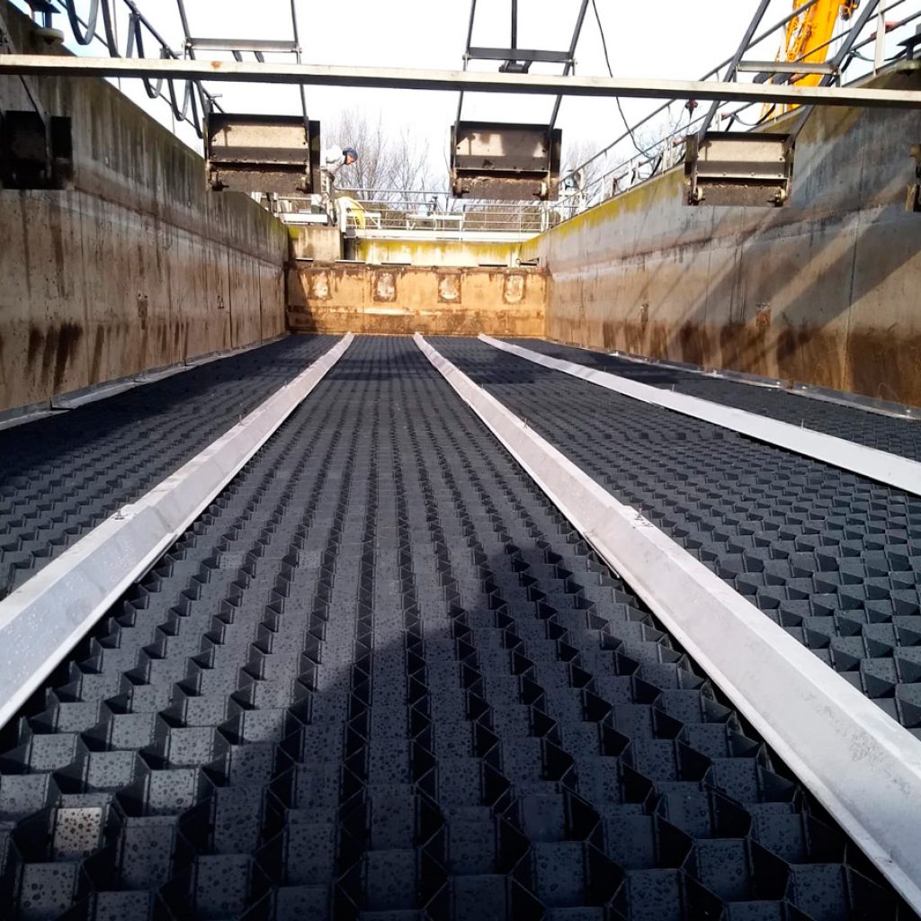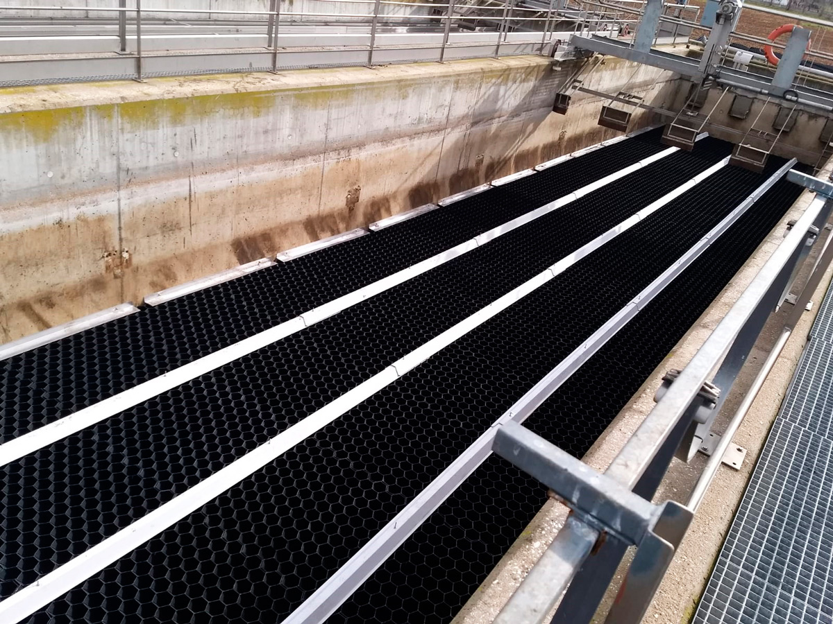 The chosen lamella technology for this project has been the PVC hexagonal TecnoTec H80, with a projected surface of 8,20 m²/m³ (the highest of its kind in the market), thus securing the maximum performance of the settler in terms of flow and solid retention capacity, combining it with the lowest clogging risk due to its very high hydraulic diameter (82 mm). This last factor is considered critical since it´s a primary decanter placed after the raw water pretreatment. The lamellae have been equipped with TecnoConverting proven and reliable SAF anti-flotation system.